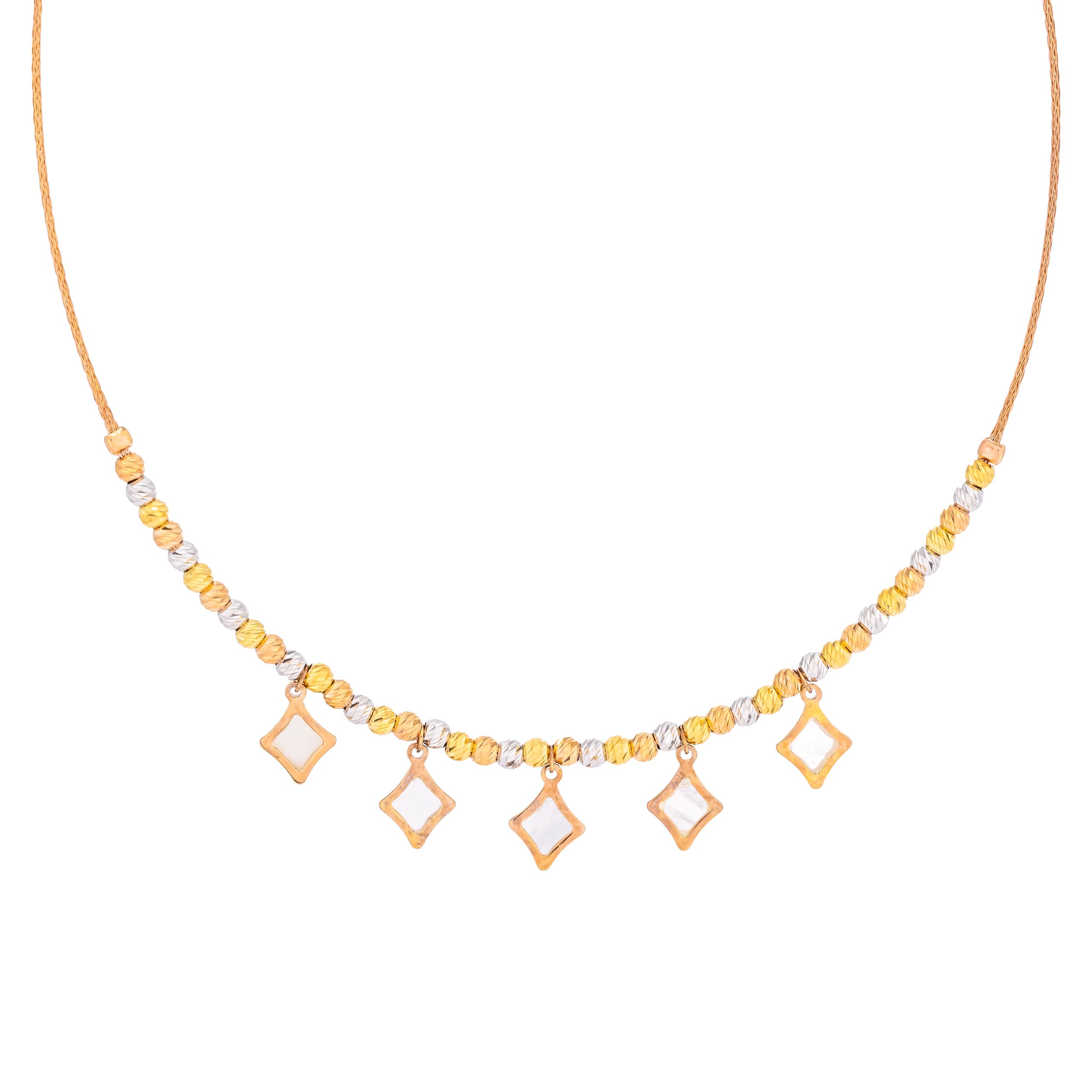 يتميز العقد بقطعة مركزية مذهلة من عرق اللؤلؤ، موضوعة بدقة داخل إطار من الذهب الأصفر عيار 18 قيراط. يضفي التقزح اللوني الناعم لصدف اللؤلؤ لمسة أثيرية على القطعة، بينما تضفي درجات الذهب الأصفر الدافئة تبايناً مذهلاً مع الألوان الباردة.