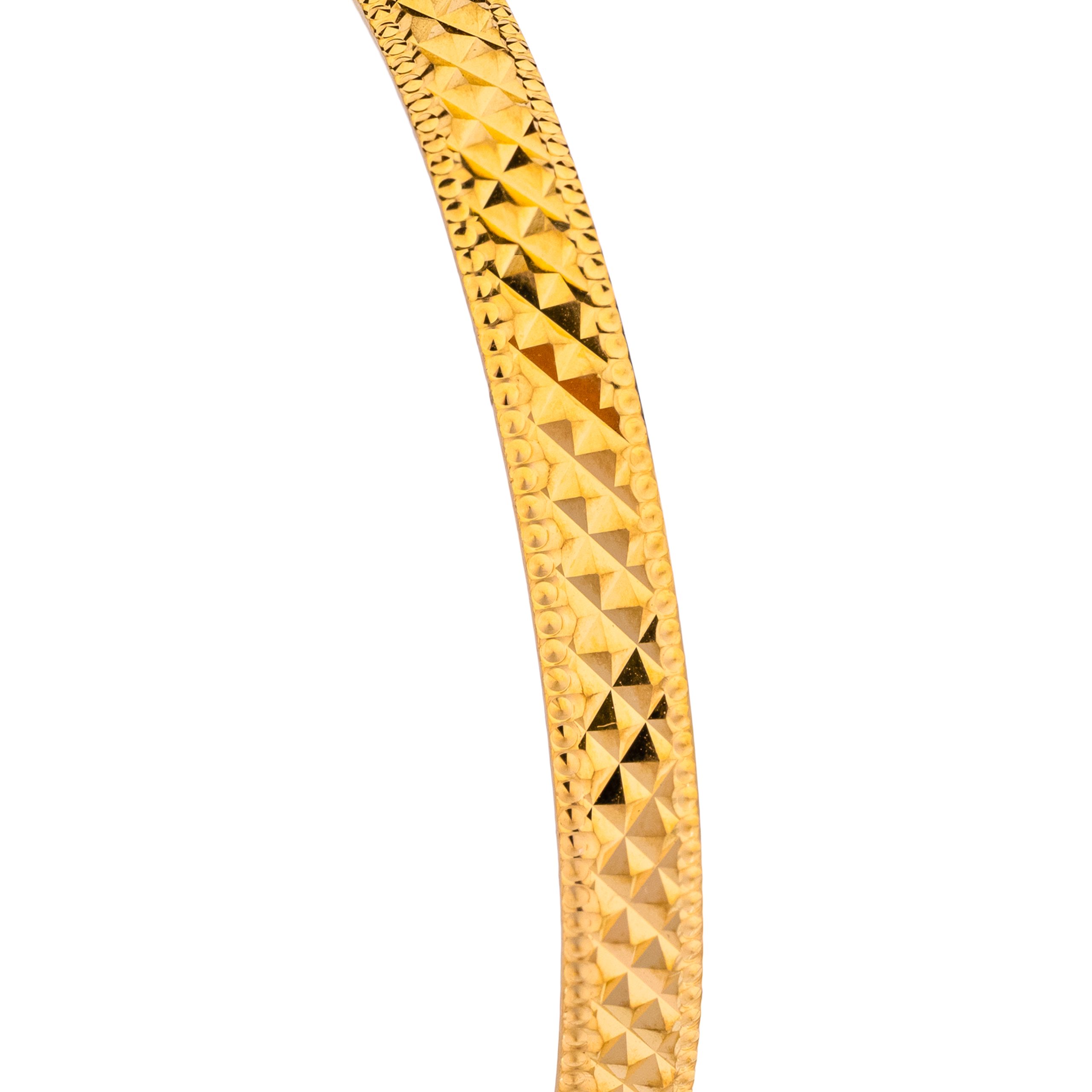 صُنع هذا السوار بأقصى درجات الدقة والاهتمام بالتفاصيل، ويُظهر براعة الحرفيين المهرة الذين أتقنوا حرفتهم على مر الأجيال. وقد تم تنسيق الزخارف المثلثية المعقدة بدقة متناهية لخلق إحساس بالانسجام والتوازن، مما يعكس التاريخ والثقافة الثرية وراء ابتكاره، وبفضل لونه الذهبي اللامع الذي يرمز إلى الرخاء والفخامة، مما يجعله خيارًا مثاليًا للمناسبات الخاصة مثل حفلات الزفاف أو المناسبات السنوية.