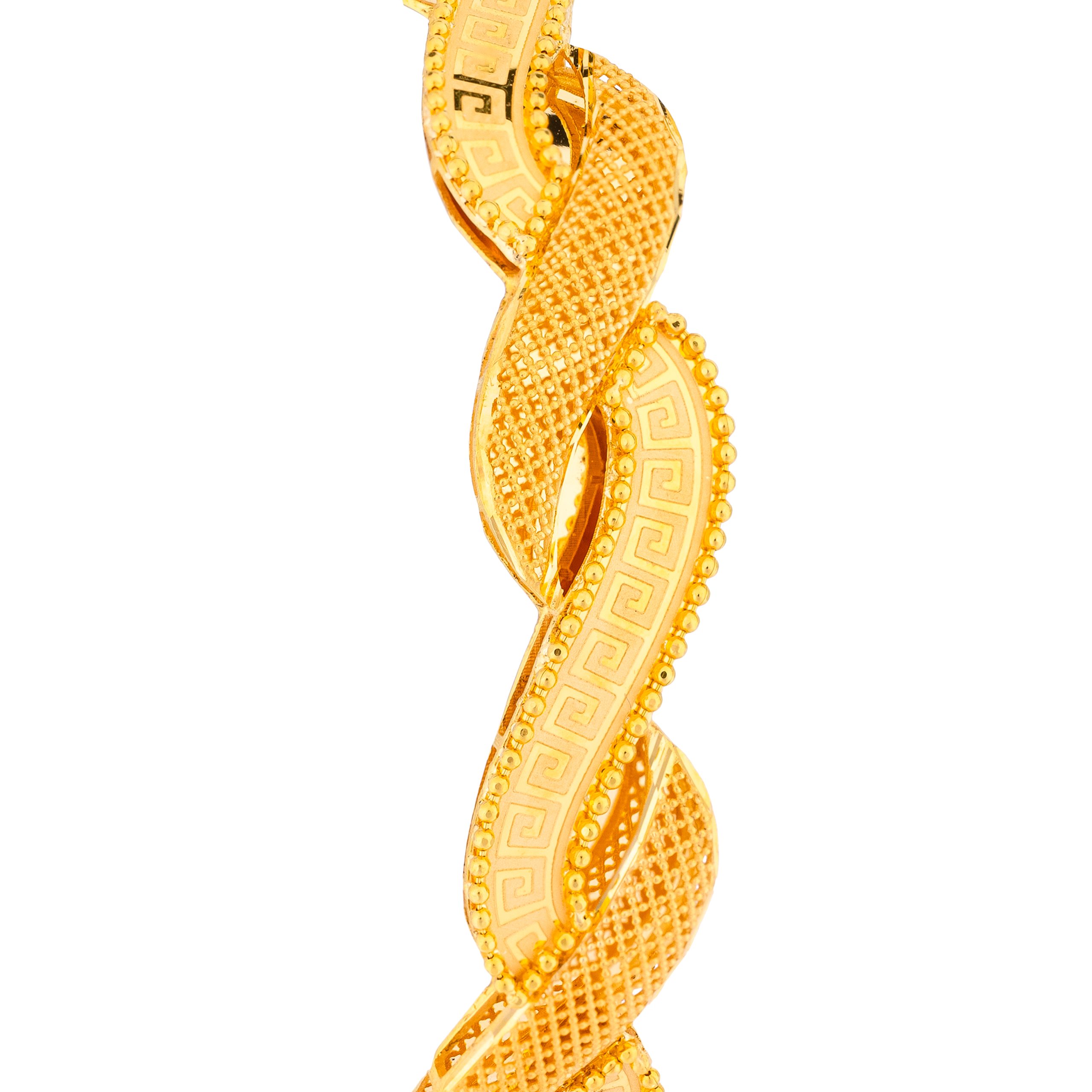 صُنع هذا السوار من الذهب الأصفر عيار 21 قيراطًا، وهو يجسد التوازن المثالي بين التصميم الجريء والتفاصيل الدقيقة. يخلق التفاعل بين اللمسات النهائية المصقولة والمزخرفة تباينًا آسرًا، مما يجعل هذه القطعة ملفتة للنظر من كل زاوية. بفضل تصميمه القوي والمريح في الوقت نفسه، يُعد سوار Century Gold كنزًا خالدًا يحتفي بفن صياغة الذهب التقليدي مع لمسة عصرية.