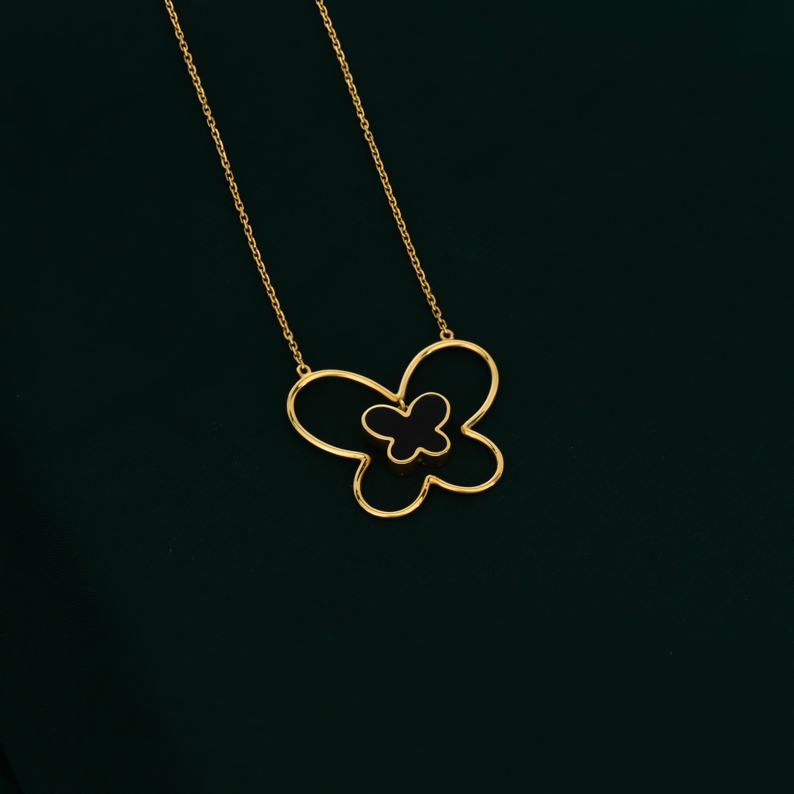 Crafted from lustrous 18K yellow gold, the Homet Necklace brings together timeless elegance and a unique design. Featuring a beautifully intricate butterfly nestled within another, this necklace is expertly crafted to strike the perfect balance between refined sophistication and bold detail. The durable gold material ensures that every curve and contour of the design remains radiant over time. Designed to make a statement, this piece captivates attention while effortlessly complementing any outfit, from casual ensembles to evening wear. Perfect for those who appreciate quality and individuality in their jewelry, the Homet Necklace is as enduring as it is enchanting.