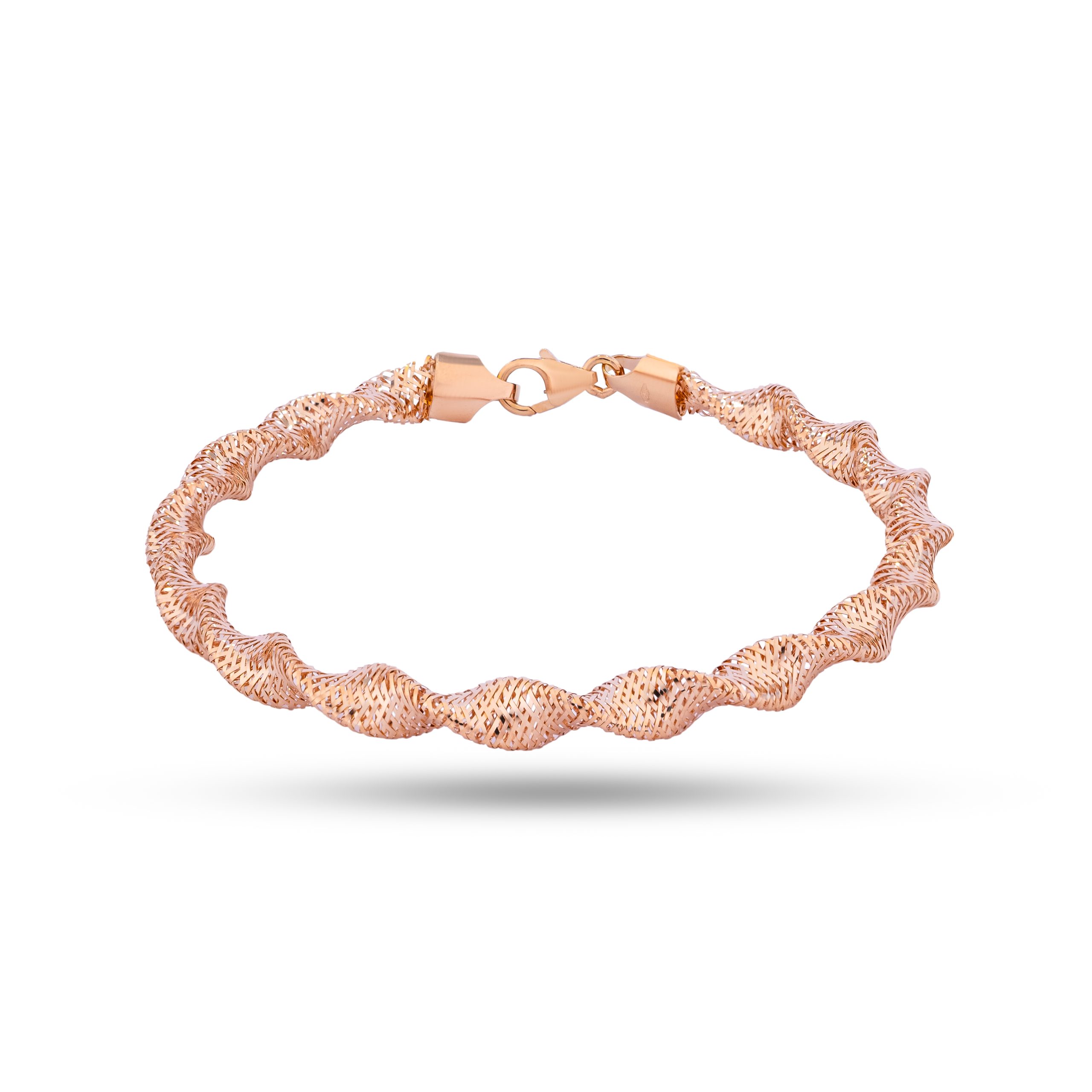 Lavin 18K Wavy Gold Bracelet presents a fluid twist of rose 18K gold, each curve reflecting a soft interplay of light across its textured surface. The bracelet’s subtle wave creates dimension and movement, while the artisan-crafted finish offers a tactile richness that feels luxurious against the skin. Securely fastened with a polished lobster clasp, this piece balances refined design with everyday comfort. Worn alone or layered, it brings a distinctive, contemporary statement to any ensemble, catching attention with its unique silhouette and understated allure.