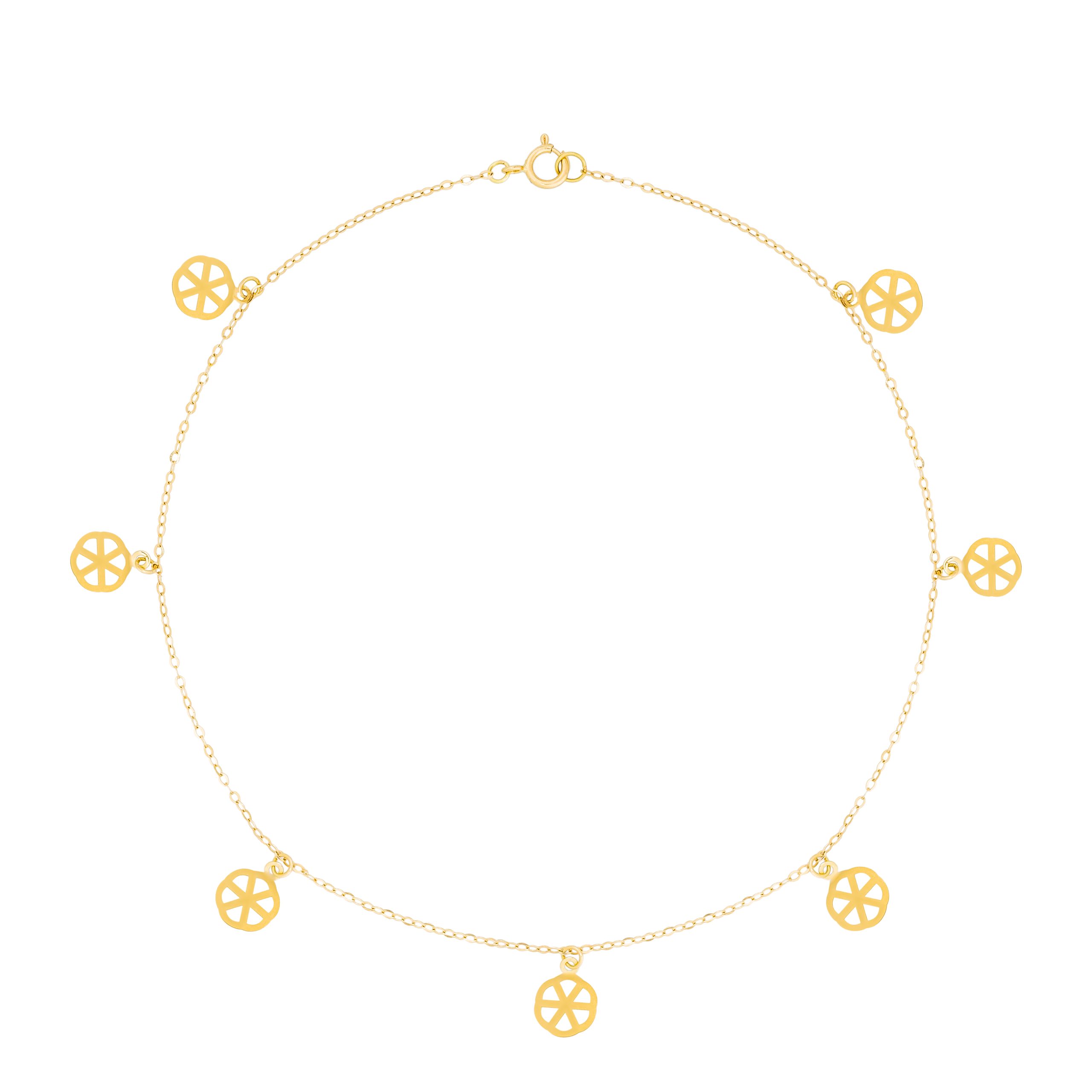The Lavin 18K Yellow Gold Anklet is a masterpiece of elegance and craftsmanship. Made from fine 18K yellow gold, this anklet showcases exquisite small floral shapes that add a subtle charm to any attire. This piece is designed for those who appreciate timeless luxury and sophistication, enhancing your ensemble with its captivating glow and intricate design. Wear it with confidence, as it seamlessly complements both casual and formal looks, imbuing you with a sense of pride and style. Each flower detail brings a delicate yet distinct allure, making this anklet not just an accessory, but a statement of your refined taste.