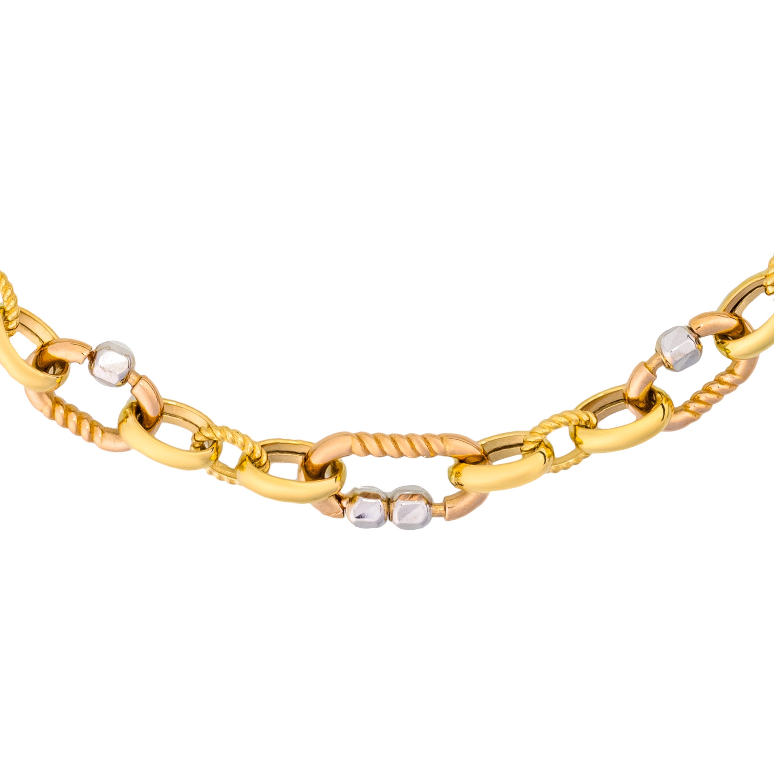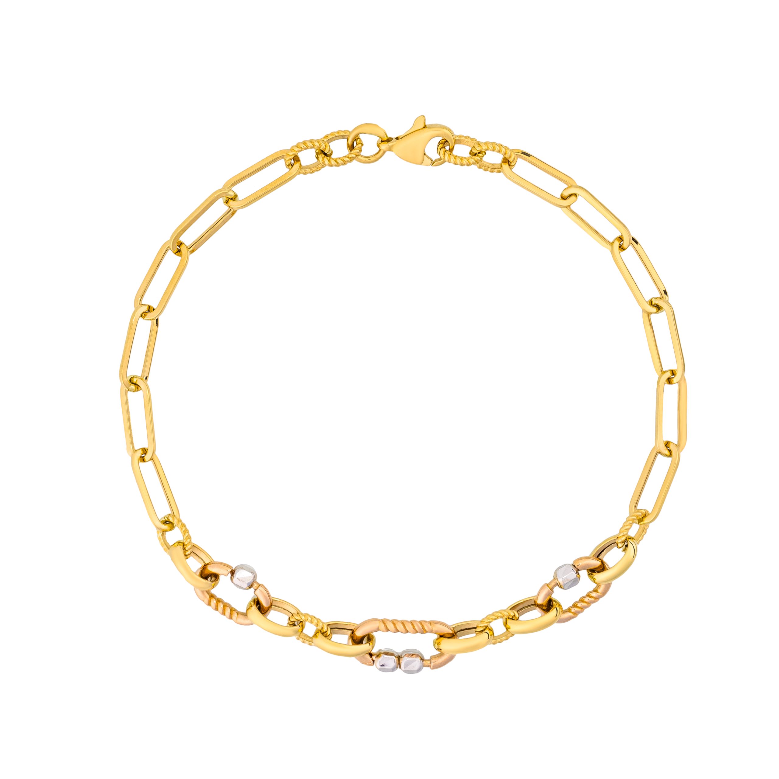Crafted from radiant 18K yellow gold, the Lavin Bracelet epitomizes effortless sophistication. Its intricate design weaves together interlinked chains of white and rose gold, creating a luminous interplay of colors that catch the light beautifully. The meticulous craftsmanship highlights its timeless elegance, making it a versatile accessory for both everyday refinement and special occasions. This bracelet is more than a statement piece it is an enduring reflection of contemporary artistry and impeccable style.The Lavin Bracelet is not just a piece of jewelry, but a work of art that captures the essence of modern luxury. Its intricate design and impeccable craftsmanship make it a true testament to the skill and creativity of its makers.