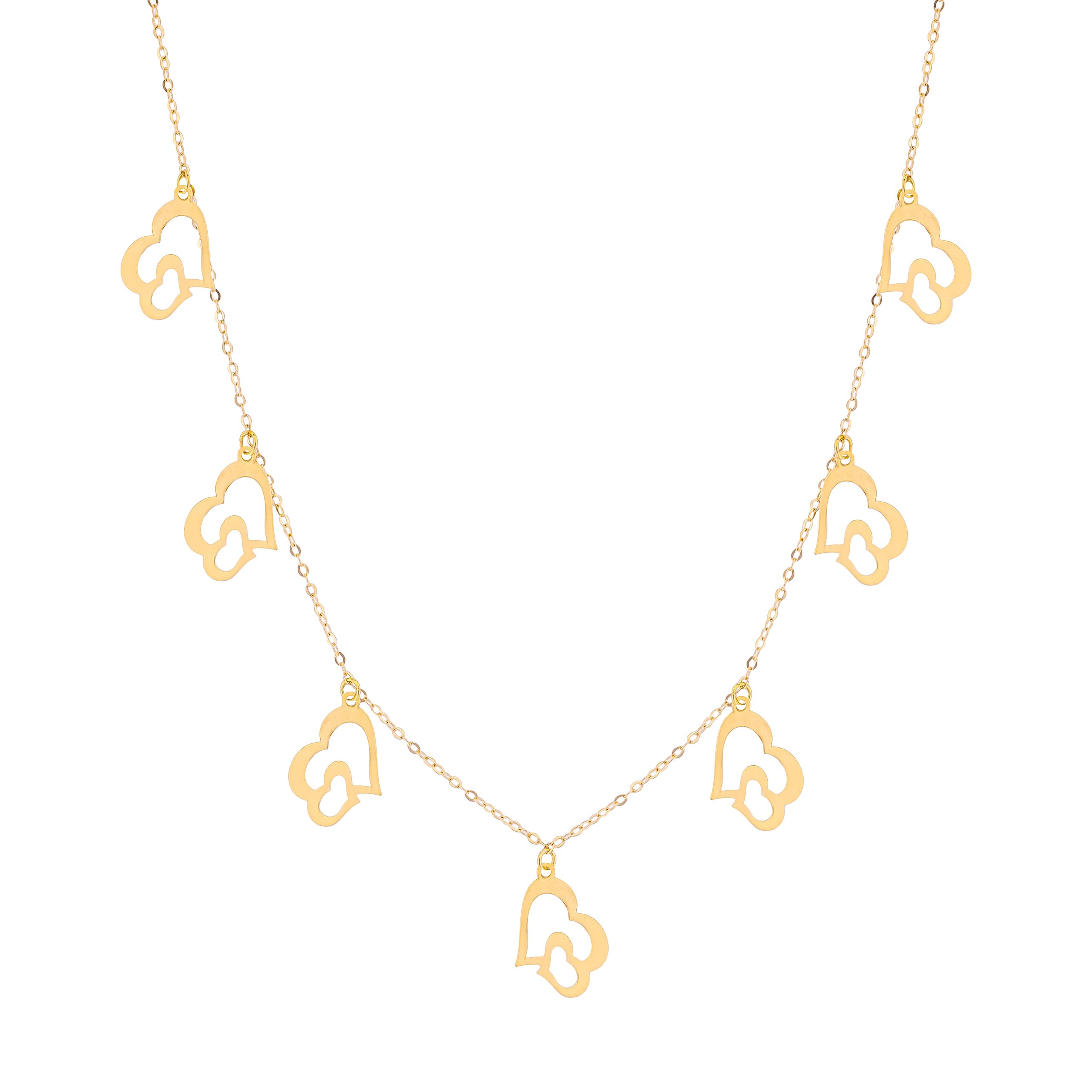 Crafted from radiant 18K yellow gold, the Lavin Necklace is a harmonious blend of craftsmanship and sentiment. Its fine chain is adorned with delicate heart-shaped motifs, each encasing a smaller heart within, creating a layered symbol of love and connection. The luminous gold catches the light beautifully, offering a subtle yet enchanting glow against the skin. Perfect for any occasion, this necklace brings an air of refined elegance to your look, making it as timeless as the emotions it represents.