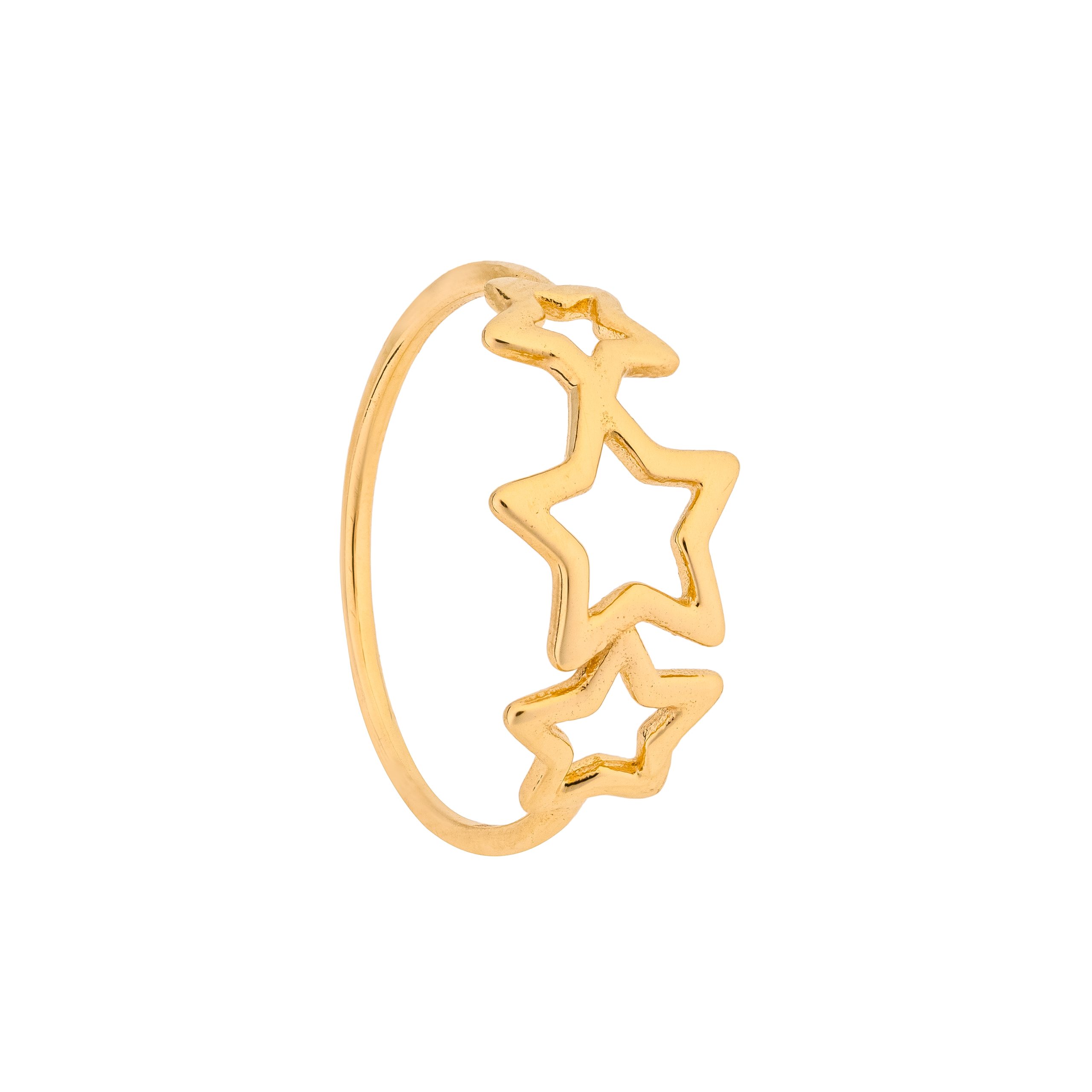 Enhance your personal style with the Lavin ring, an elegant and sophisticated piece that exudes effortless charm. This finely crafted ring features three open star shapes that are delicately connected in a seamless row, creating a modern and unique design. The use of hollow gold adds to the lightweight and comfortable feel of the ring, making it a versatile accessory for everyday wear or special occasions.