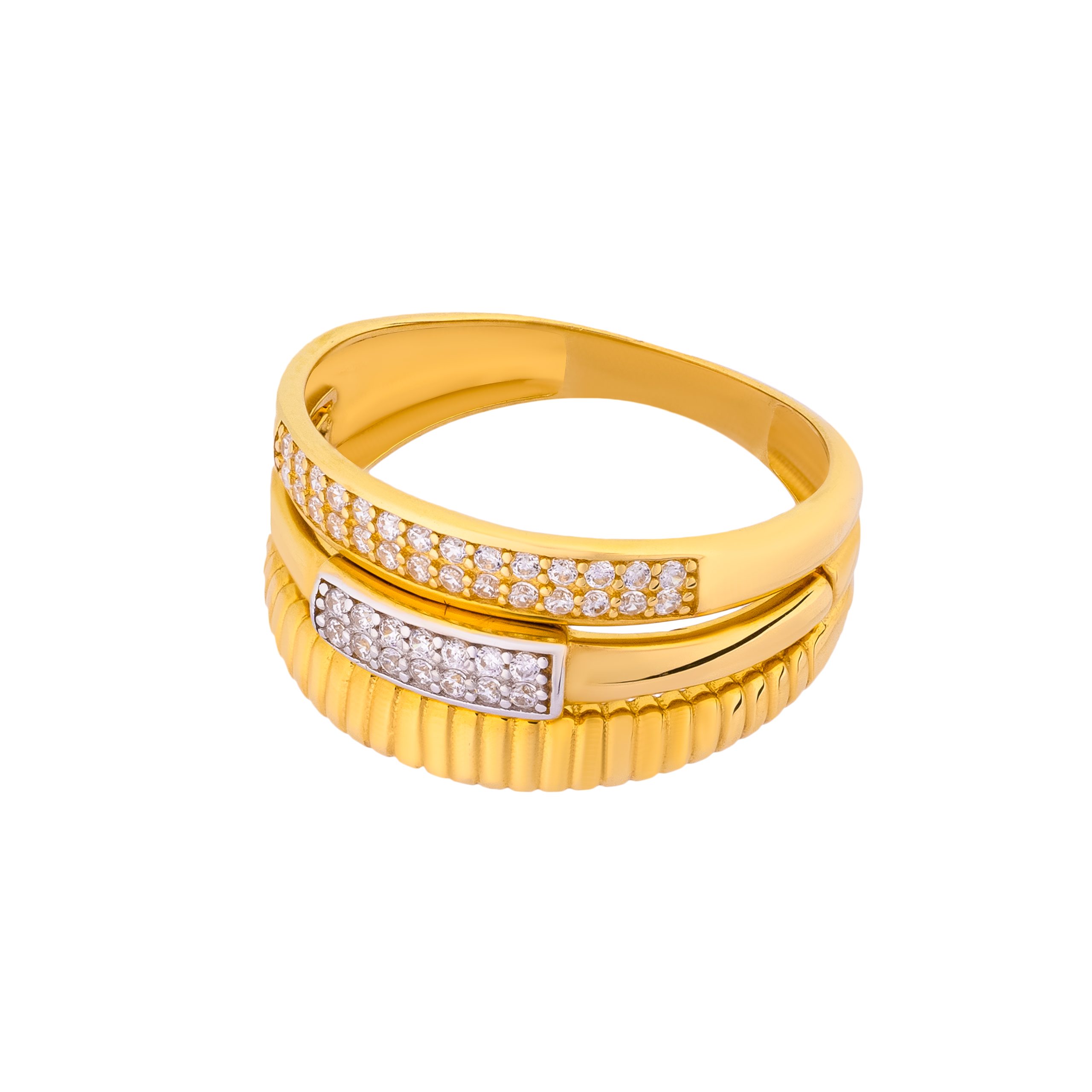 The Lavin 18K Yellow Gold Ring embodies the perfect harmony of contemporary design and timeless sophistication. Expertly crafted from luminous 18K yellow gold, this triple stack ring offers a distinctive silhouette that captivates from every angle. The addition of a sleek white gold accent introduces a subtle contrast, while its surface sparkles with meticulously set zircon stones, radiating an understated brilliance. Designed with both elegance and versatility in mind, this ring enhances every style whether as a refined everyday piece or a statement for special occasions. Perfectly balanced between bold and graceful, the Lavin 18K Yellow Gold Ring is a true celebration of modern craftsmanship.