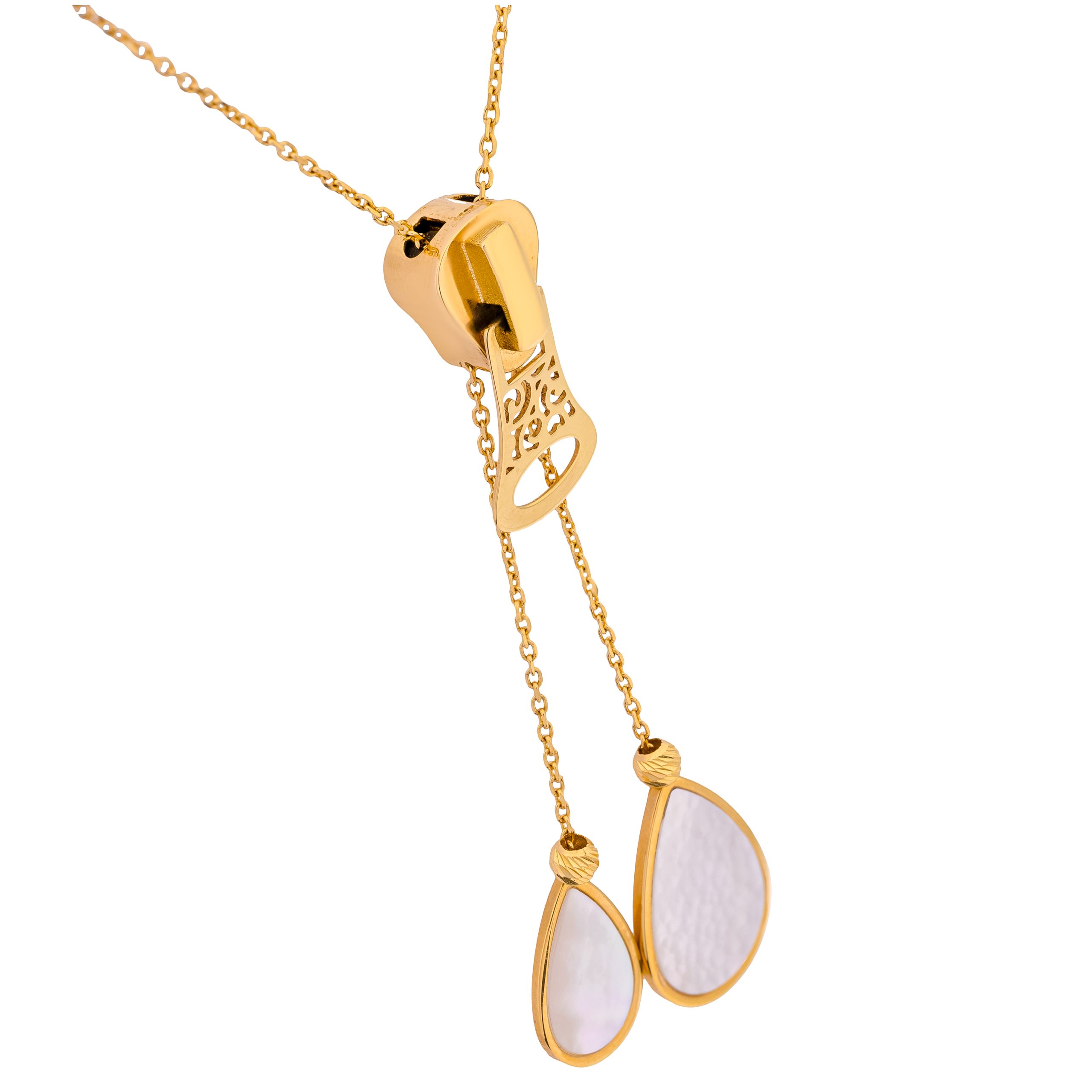 Suspended from delicate gold chains, two teardrop-shaped pendants shimmer with luminous mother of pearl, catching light with every movement. The contrast between the polished gold and the soft, iridescent tones creates a look that is both refined and fresh.