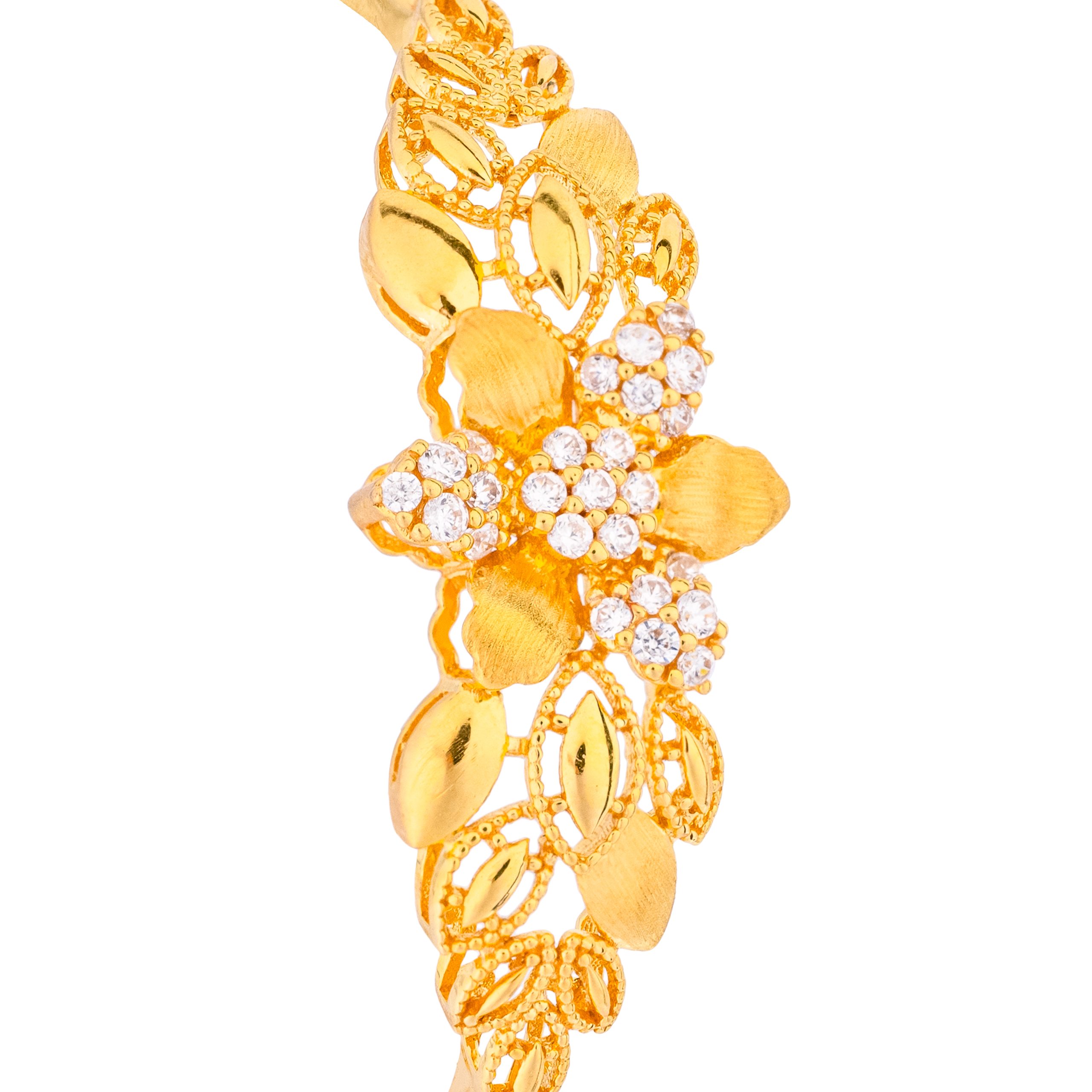 Meticulously crafted from 21K yellow gold, the Rayka Bangle seamlessly combines fine craftsmanship with playful charm. Designed for kids, this exquisite bangle features a centerpiece shaped like a delicate flower adorned with shimmering zircon stones. Encircling the design are intricately shaped leaves, creating a harmonious balance of nature-inspired elegance. Its lightweight yet sturdy structure ensures both comfort and durability, making it perfect for little ones to wear daily or on special occasions. A timeless piece, it adds a brilliant sparkle to any outfit, celebrating individuality with its refined artistry.