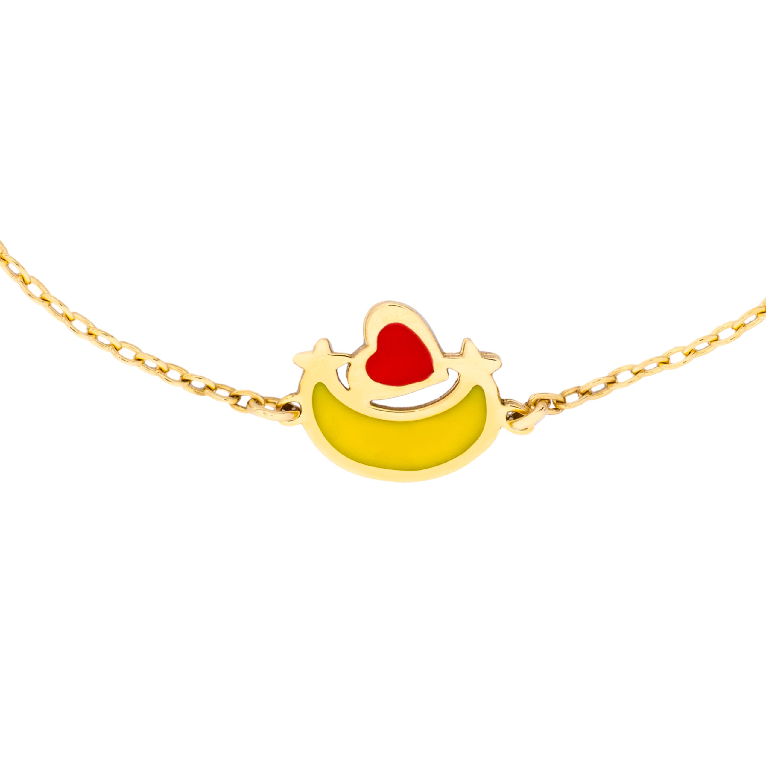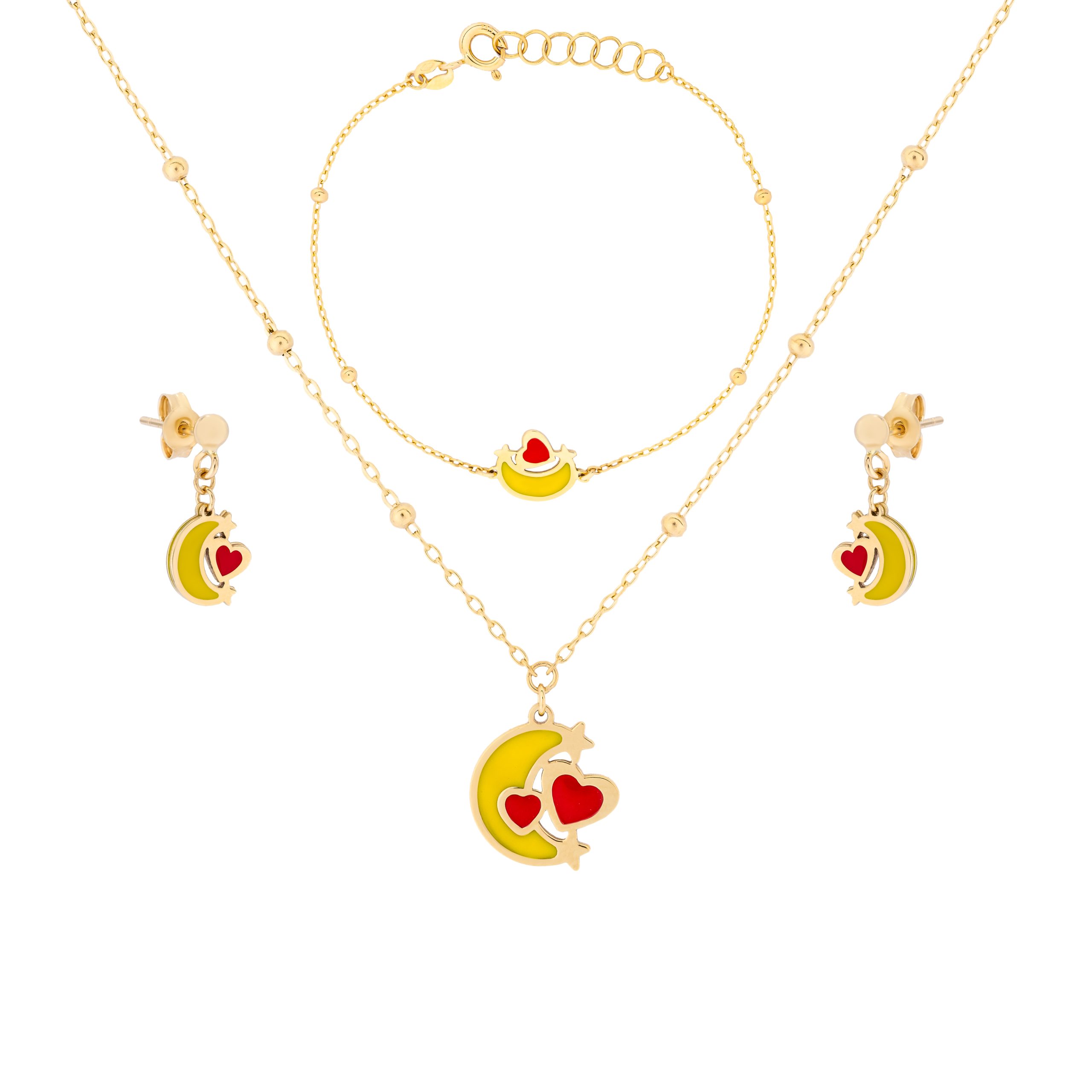 Uranus 18K Gold Moon Jewelry Set for Kids showcases polished 18K yellow gold in whimsical crescent moon shapes, each piece delicately accented with a vivid red enamel heart. The set includes petite stud earrings, an adjustable necklace, and a bracelet, all crafted to be lightweight and comfortable for young wearers. Playful yet refined, the soft glow of genuine gold is paired with the cheerful pop of red, making every accessory in the set both charming and eye-catching. Suitable for special occasions or adding delight to everyday moments, this jewelry set offers children a joyful way to express their individuality with pieces that feel both precious and playful.