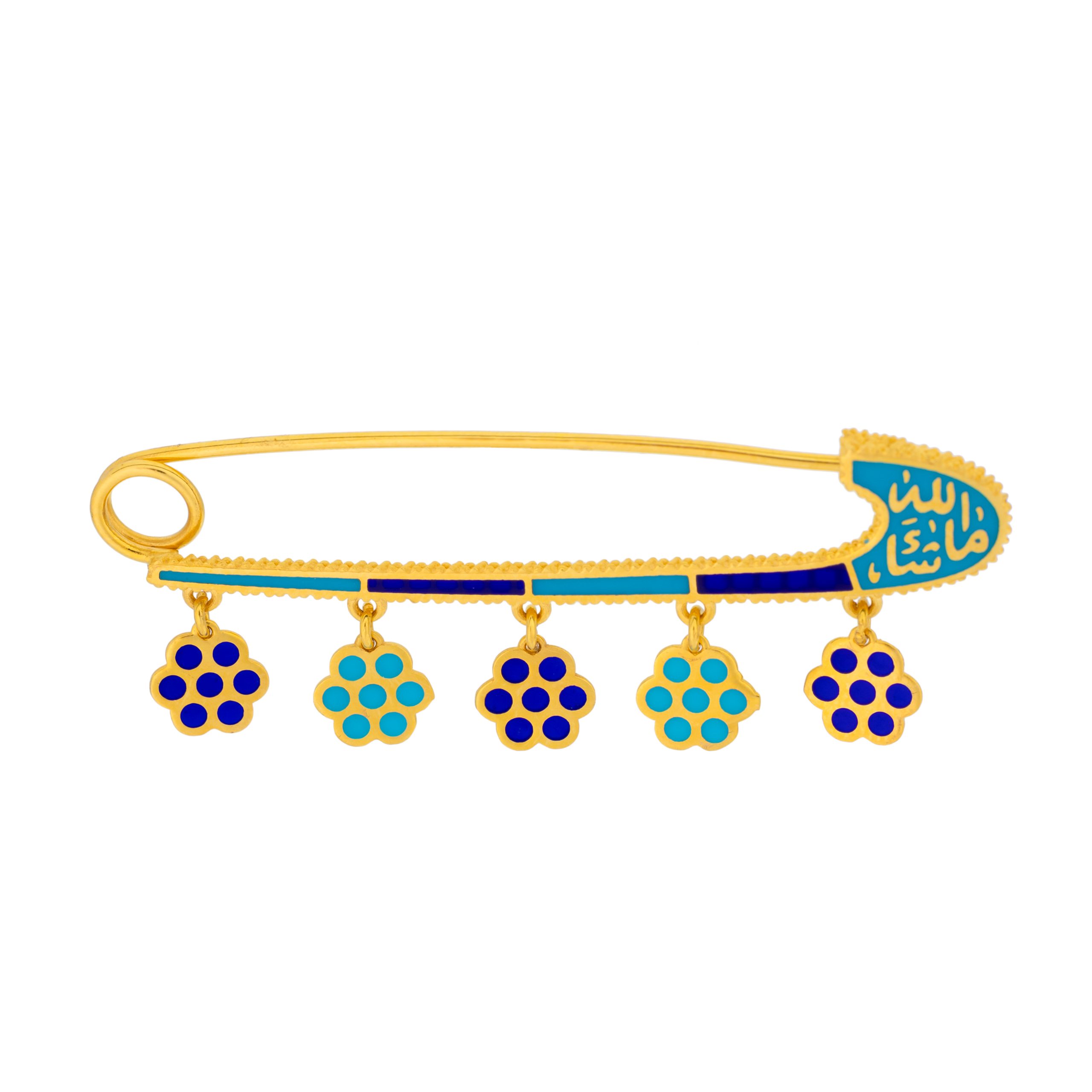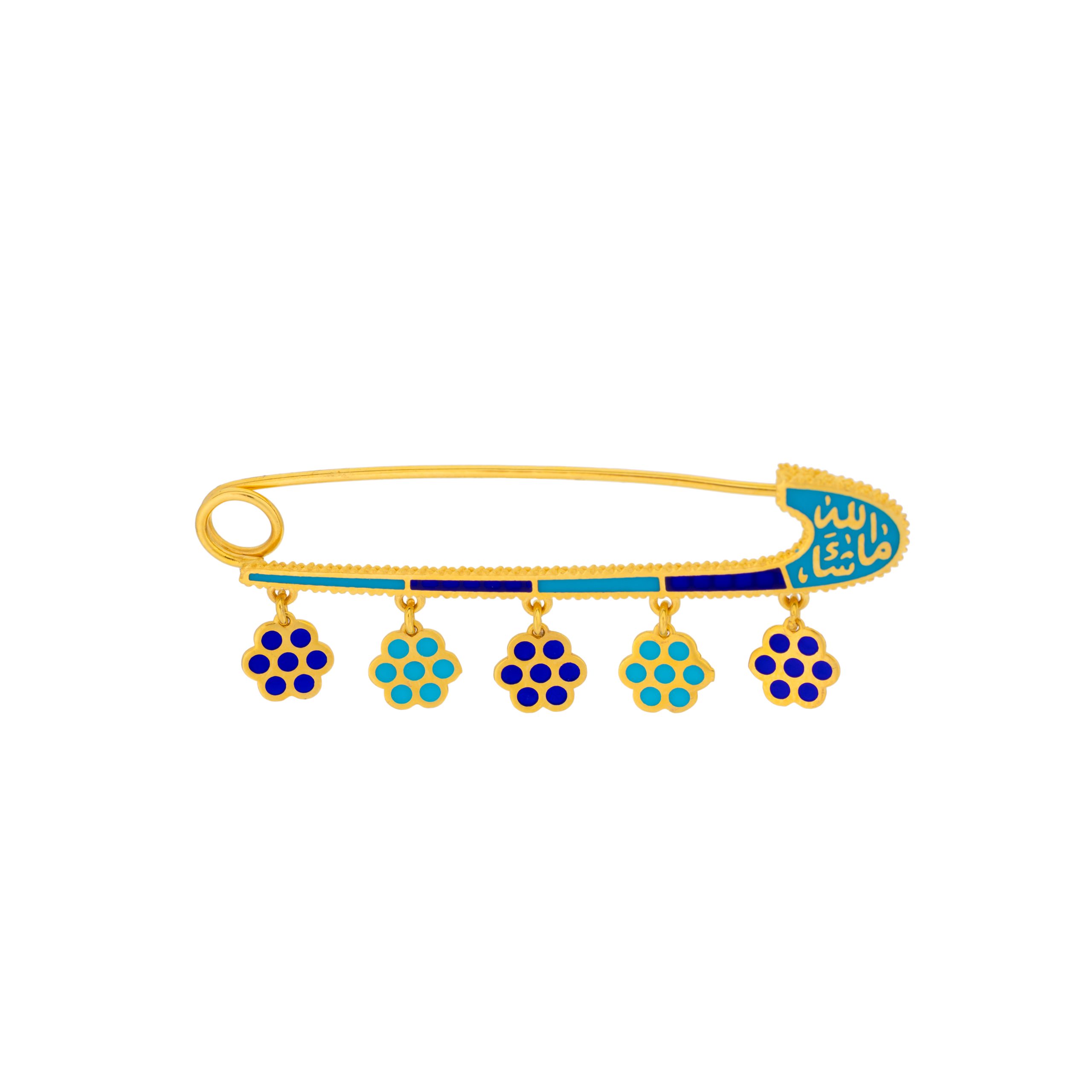Crafted from luminous 21K yellow gold, the Uranus Pin is a celebration of heritage, artistry, and protection. Enhanced by intricate Meena work, its vibrant detailing brings the piece to life, seamlessly blending tradition with exceptional design. At its heart lies the word “Mashallah,” elegantly inscribed to carry a meaningful cultural message with enduring significance.Thoughtfully designed for children, this lightweight yet durable pin is more than an accessory—it’s a keepsake that stands the test of time. Whether adorning a dress, jacket, or even a backpack, the Uranus Pin adds a refined charm and a touch of timeless beauty to any ensemble, making it the perfect gift for life’s precious moments.